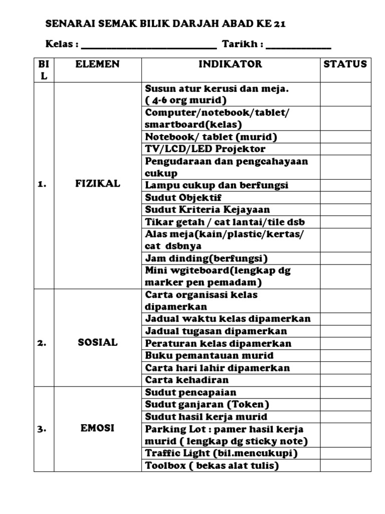 Senarai Semak Bilik Darjah Abad Ke 21 Pdf